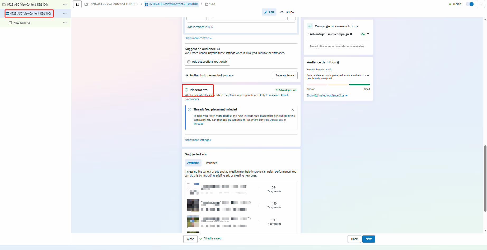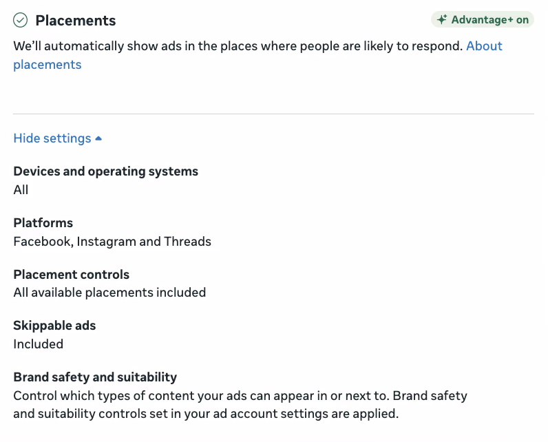 - Ad Set 层级设置,设置“投放版位 Placements”,可选“自动版位 Advantage+ placements (recommended)” 或 “手动版位 Manual placements”