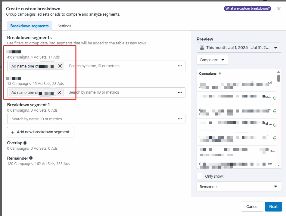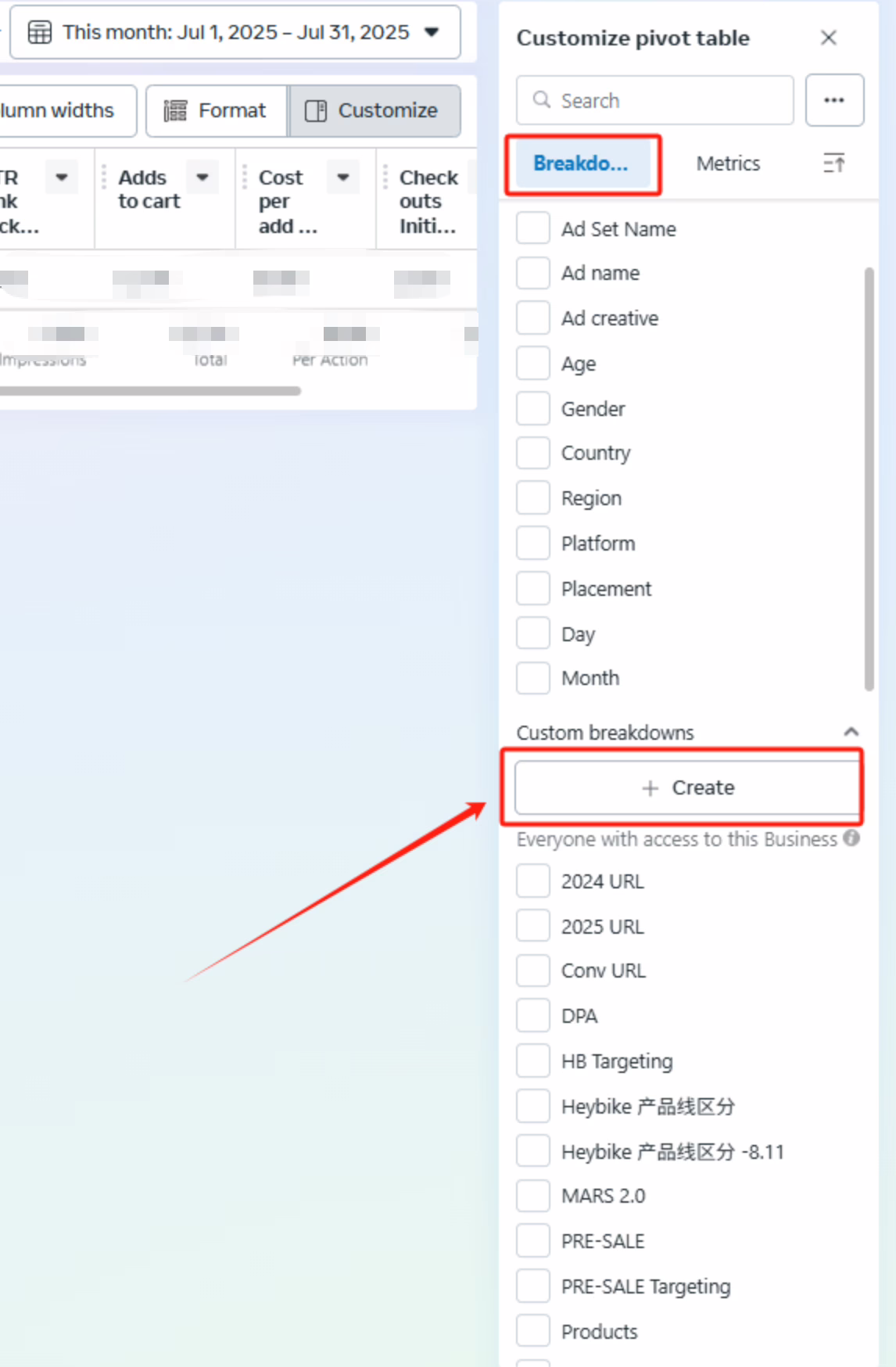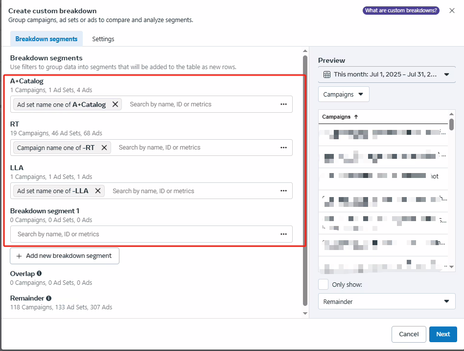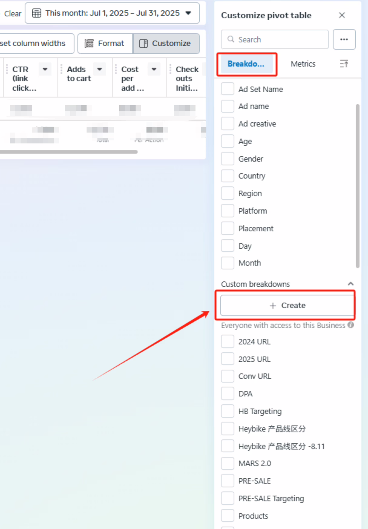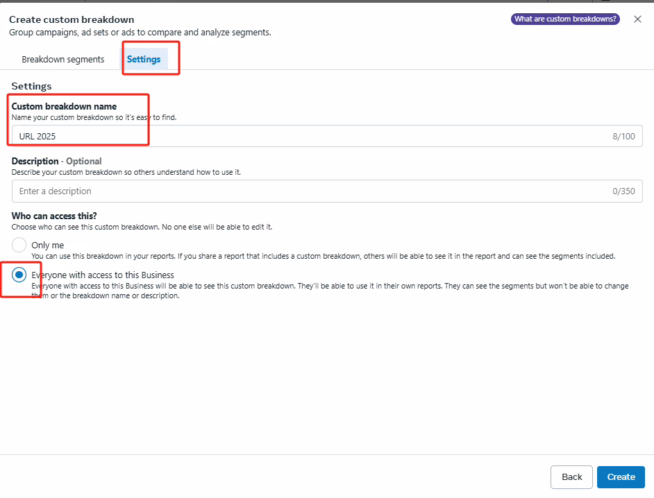 - Breakdown 下选择新建 > 按照自身命名风格分别设置好各受众维度分类字段(如广告组层级为区分受众维度拉取字段,字段需要唯一且不能与其他受众维度存在包含关系)> 右边栏设置好该 Breakdown 的命名