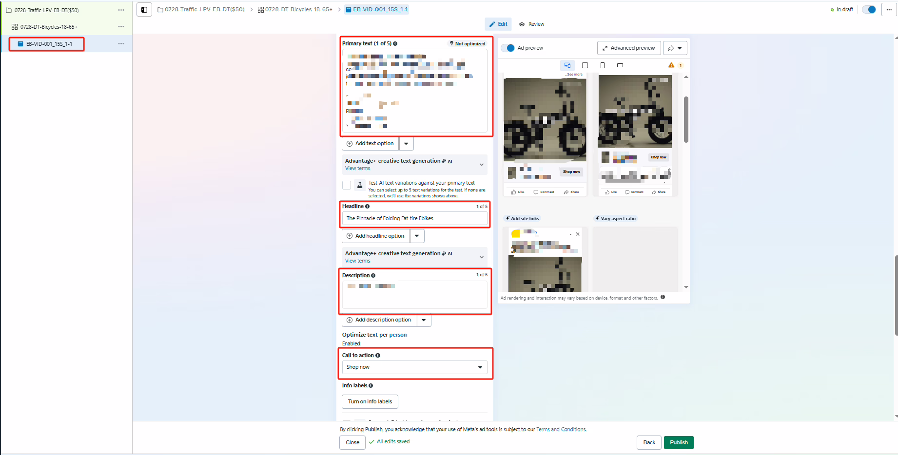 - Ad 层级,选择“创意形式 Format”和“目标位置 URL Destination”,另外在标题栏上注意选上“Current Price”,同时设置好广告文案和行动号召,其余设置与常规广告一致