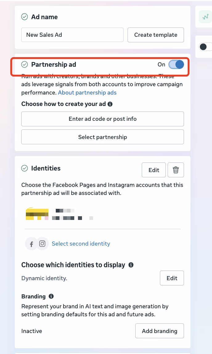 - Ad 层级设置,广告命名(落地页-素材编号),选择开启或关闭 “合创广告 Partnership ad”,选择广告投放的载体/身份,即“Facebook 公共主页 Facebook Page”、“Instagram 账号Instagram account” 和 “Threads 账号Threads profile”