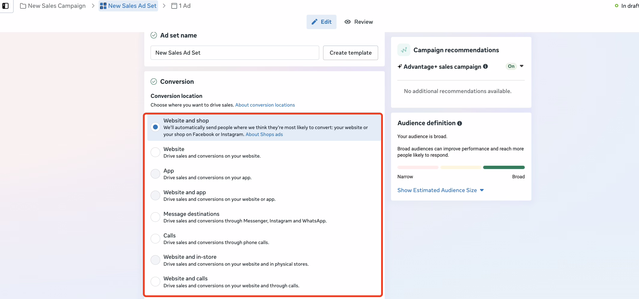 - 选择“自动投放位置”或“手动投放位置”(如 Facebook 动态、Instagram 故事)。