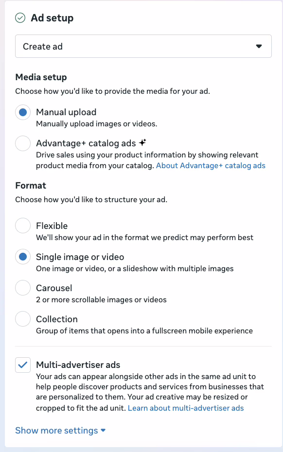 - Ad 层级设置,选择“手动上传素材 Manual upload” 或 “使用目录 Products from your catalog”,选择“创意形式 Format”