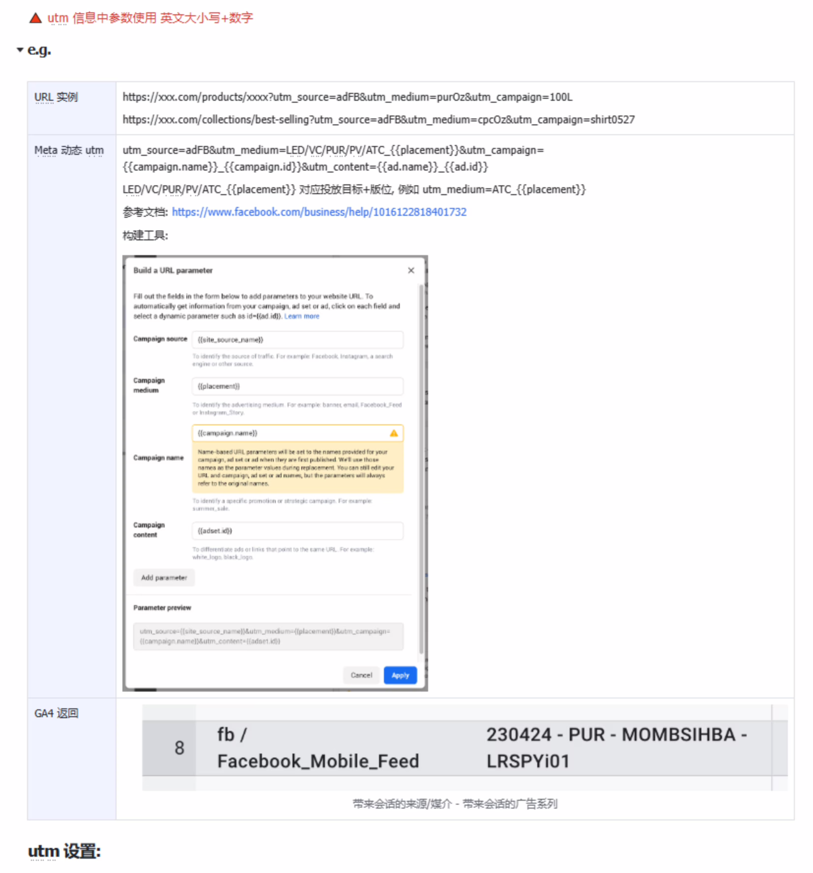 - Ad 层级设置,UTM 参数填写,发布广告;同时 PUR 目标的 UTM 参数设置为utm_source=adFB&utm_medium=PUR_{{placement}}&utm_campaign={{campaign.name}}_{{campaign.id}}&utm_content={{ad.name}}_{{ad.id}}