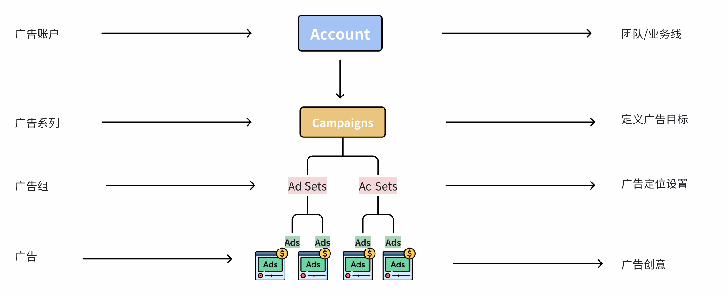 - 广告系列:管理所有广告活动,查看层级结构(Campaigns、Ad Sets、Ads)。