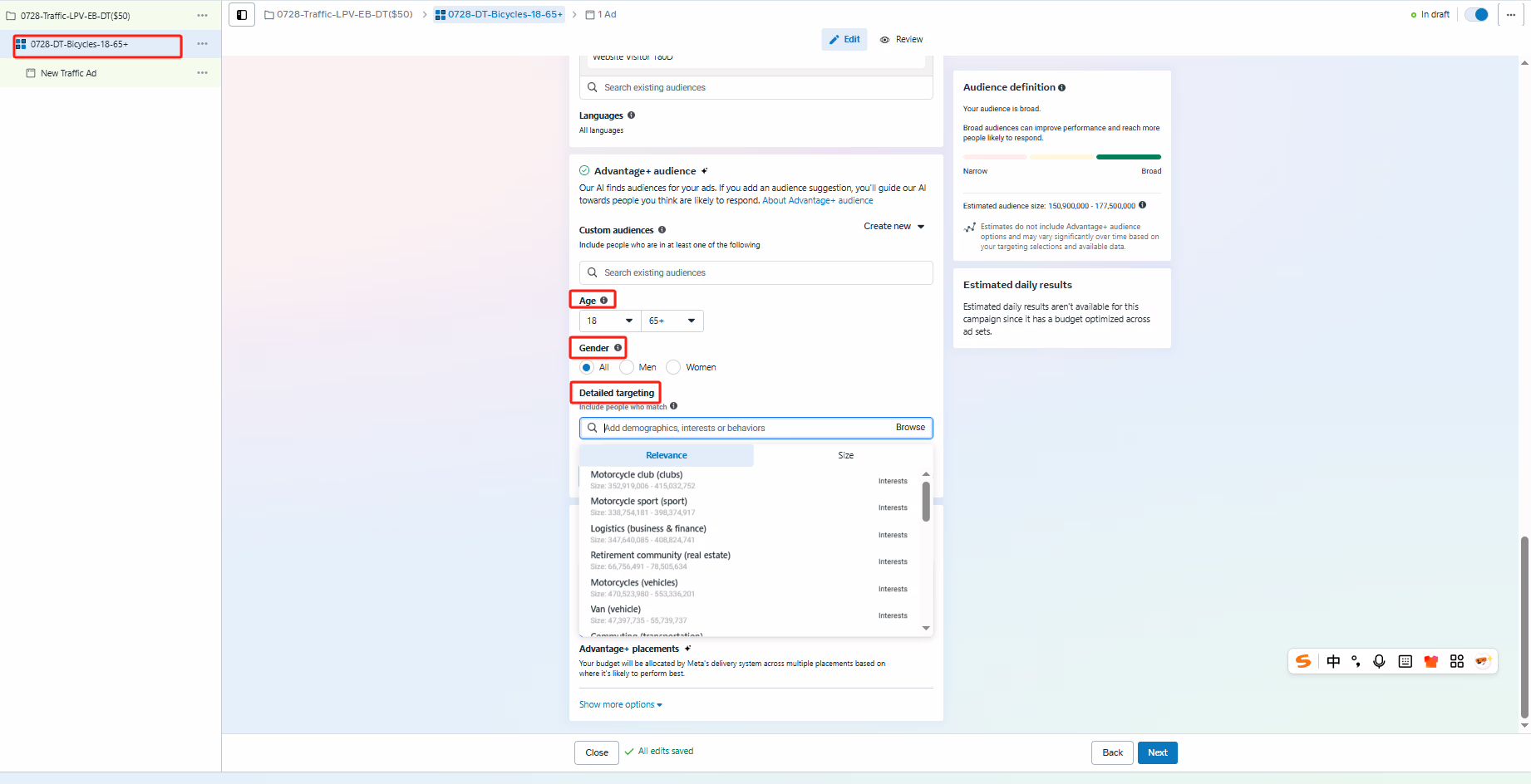 - Ad Set 层级设置,设置“年龄段 Age”、“性别 Gender” 和 “兴趣词定位 Detailed targeting”