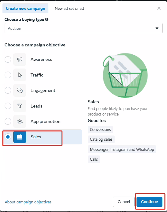 - 选择“销量 Sales”,再点击“继续 Continue”