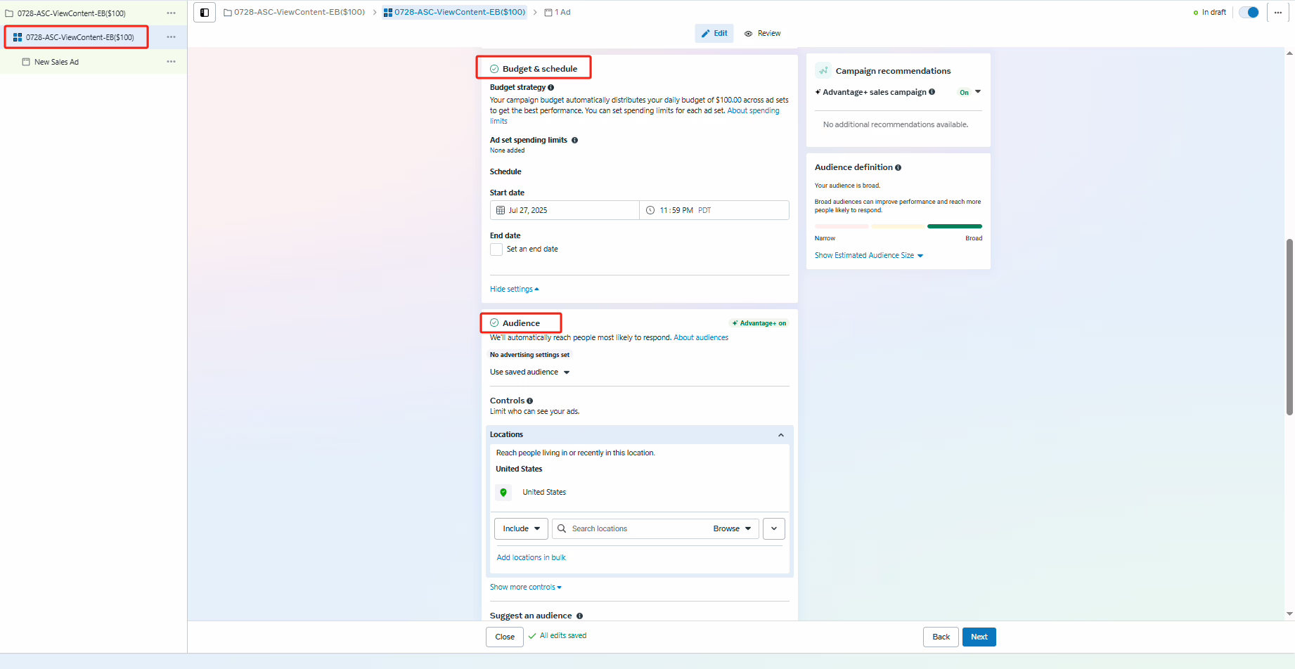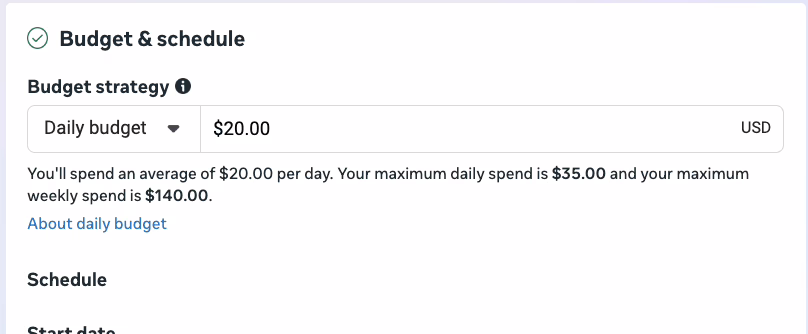 - 设置每日或总预算(Campaigns 层级选了组预算才需要设置),建议初始预算为 1/3 CPA,逐步优化。