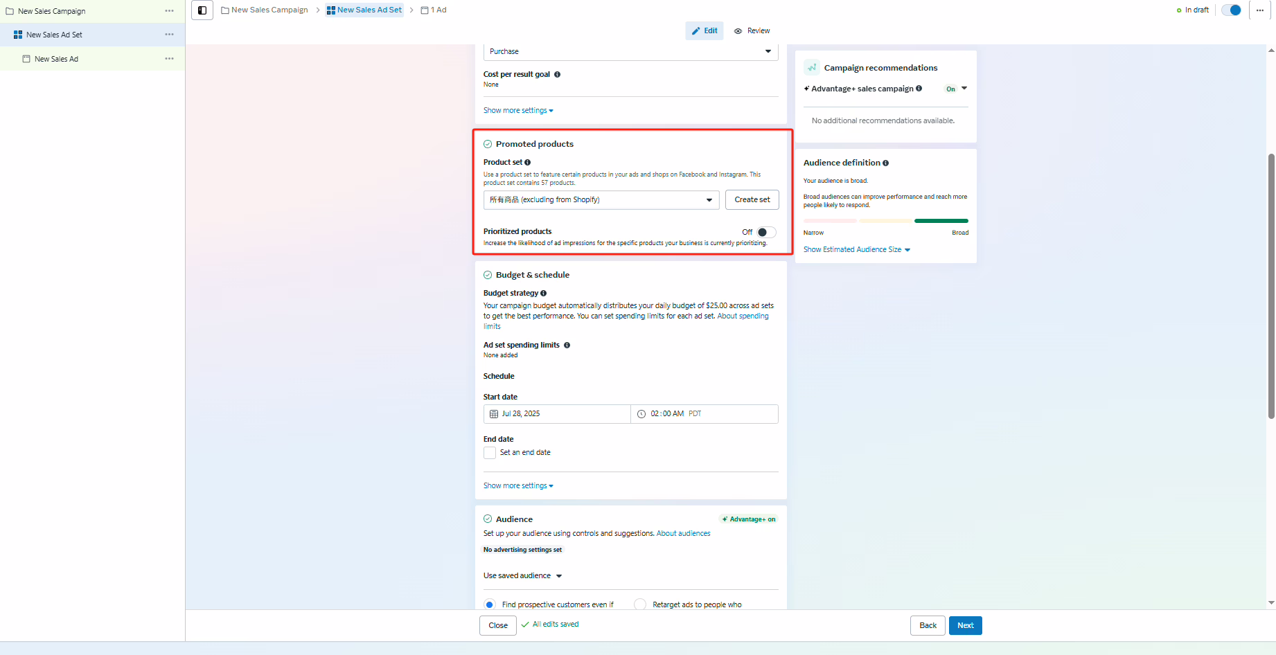- Ad Set 层级,选择好对应的“产品系列 Product set”,其余设置与常规广告一致