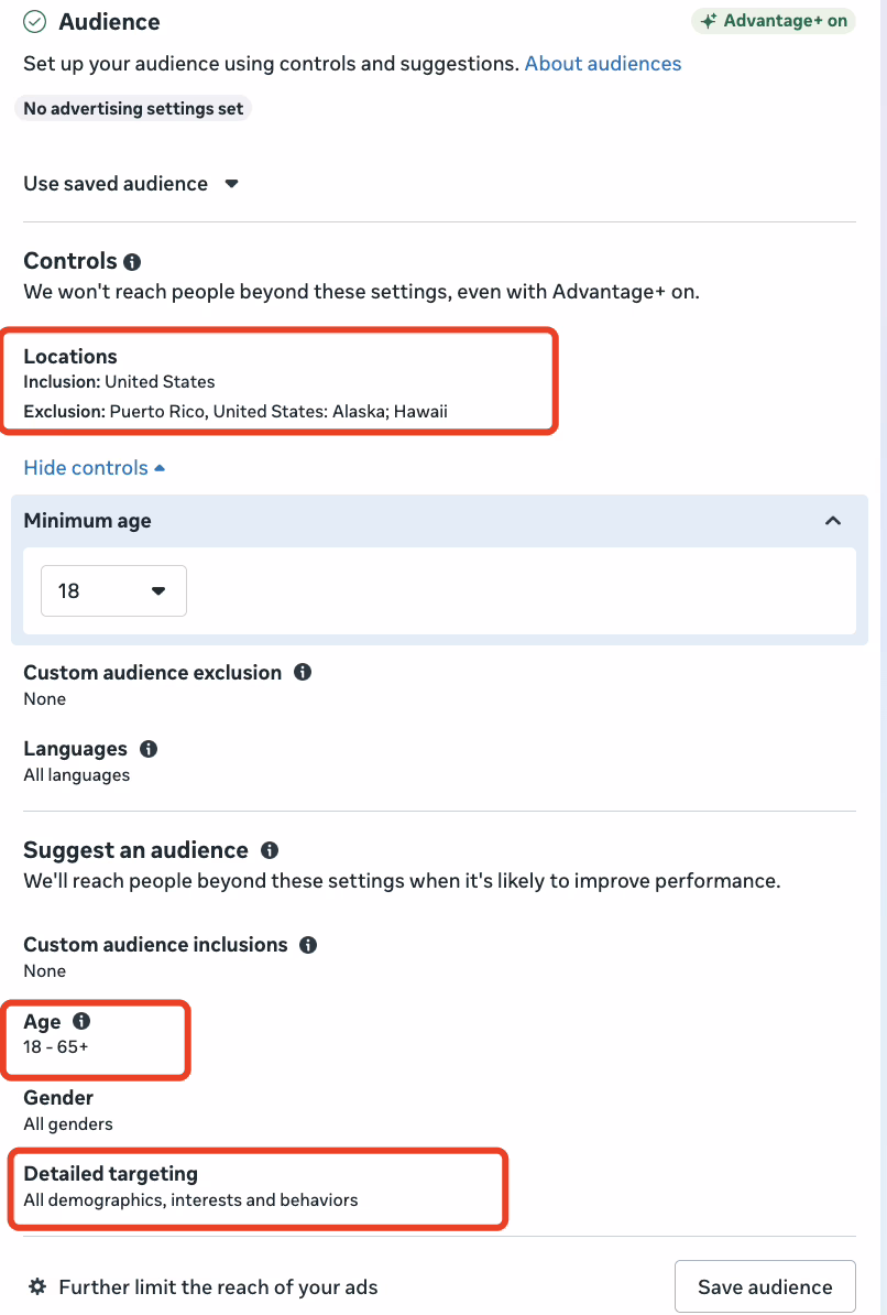 - Ad Set 层级设置,设置“投放区域 Locations”、“最低年龄 Minimum age”,同时可设置“排除部分非本次目标想要触达的自定义用户 Exclude these custom audiences,另外设置好“年龄段 Age”、“性别 Gender”、“兴趣词定位 Detailed targeting”