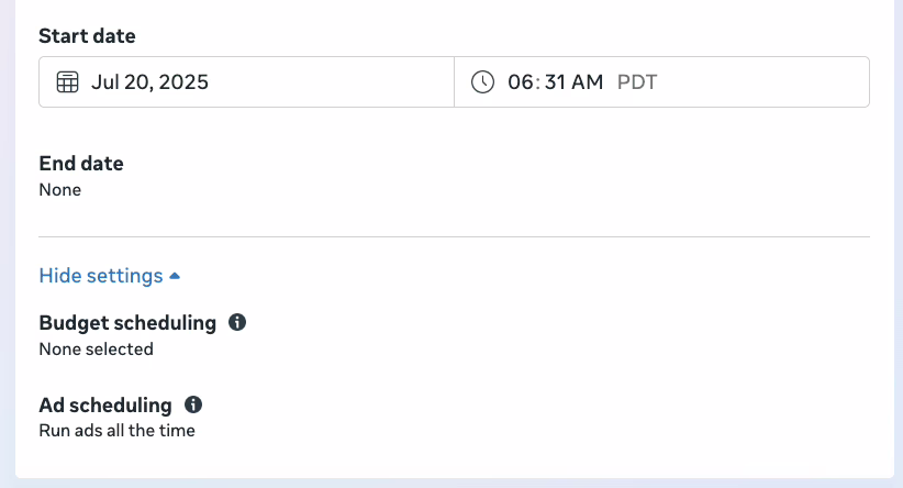 - Ad Set 层级设置,设置广告排期,“开始 Start date”和“结束 End date”时间,根据实际情况按需设置
